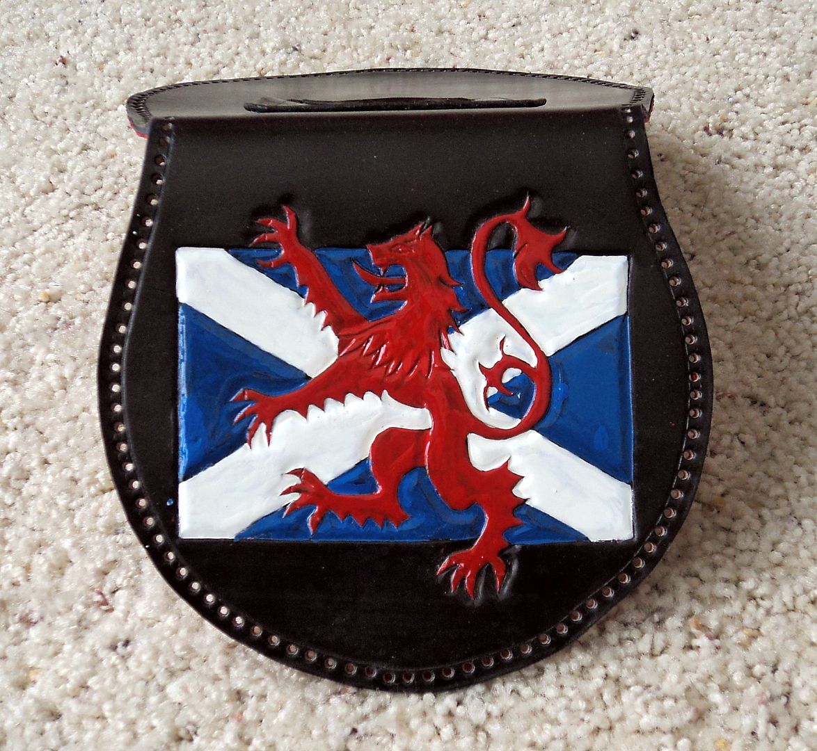 MNlad, Thanks for your comments. One idea I have is to do it in brown with the blue of the Saltire stamped with a background tool and the white stripe coated so that it comes out lighter than the rest of the sporran. I agree that less is better most times. I will reduce it in size also. LOL, I usually do a new design on a piece of scrap leather first, but I've done several Lions and wanted to see how it would turn out. My biggest problem with this piece is that I used Super Shene on the leather before painting it and the paint is flaking off!