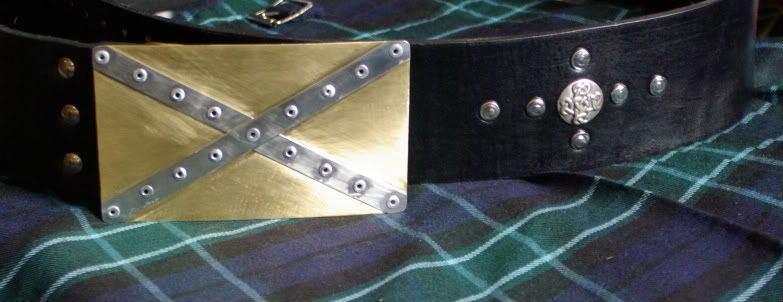Being a "Gentleman of Substance", I often find it very hard to locate belts that fit, let alone one large enough to qualify as a kilt belt... So I thought I would put one together. I bought a 3" wide strip of leather from Tandy Leather, shaped, dyed and sealed it, then added a buckle I put together in my shop. I could have saved a few hours labour with an inexpensive re-enactment style buckle, but where's the fun in that? There's not much choice in 3 1/2" wide buckles either!