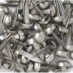 After talking about these with the woman at the craft shop, I'm thinking the easiest way to build these up is to mock them up using straight sewing stick pins, on a piece of soft pine or balsa wood, as a sort of jig. I have a small very sharp leather-working awl with which I plan to drive two small holes through the hub where the ribbons all come together. Into each of those holes I can push small silver scrapbooking brads like these...