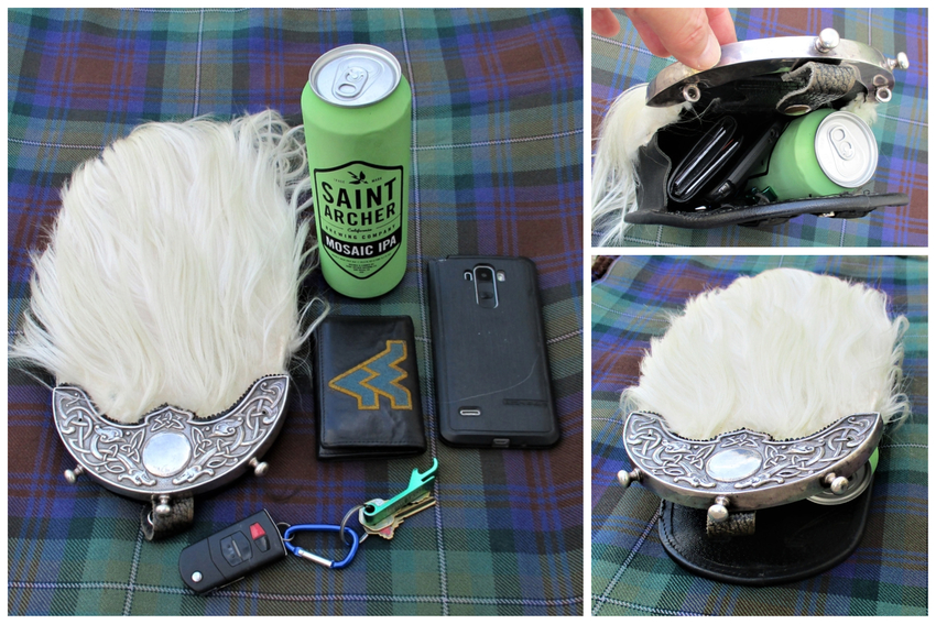 In suit or black tie mode, I put my wallet and cellphone in my coat pockets, then use my sporran for miscellaneous items, like keychain, car-key-fob, etc.