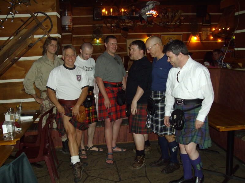 l-r CCGA3359 wearing the desert camo FK, Barclay showing of the latest fashion trend the CCK mini kilt in Maple Leaf, Josh from Tennessee whispering Buchanan "look at me", the sockless SOKS NY'er Wompet with an ever so "McNaughty" McNaughten CCK, CCK's own "I'm to cheap to make my own kilt" MacHummel showing off a future client's kilt compleat with beer stains*, ScoutNiagara sporting the latest in sleepwear & finally McMurdo about to show his BOIOS displaying how to sway the ladies in his gorgeous Isle of Skye.