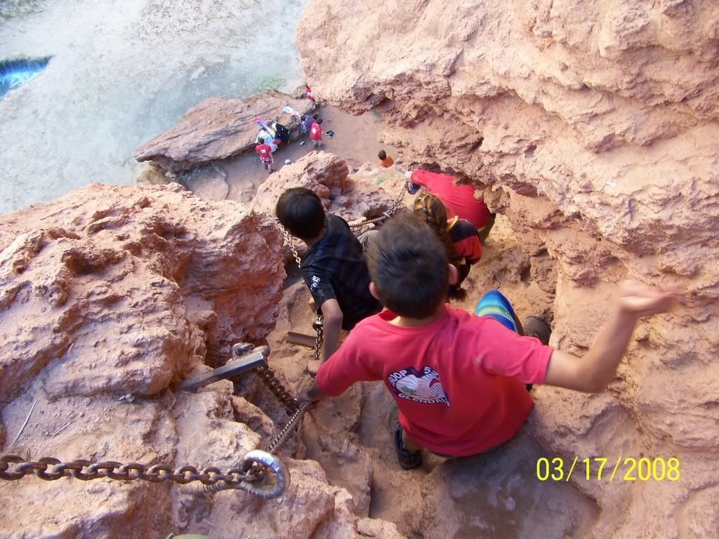 To get down Mooney Falls you have to clamber through travertine caves and then climb down using a chain...a chain that is always wet from the waterfall spray. I don't have a pic of it but there's one place where you walk along a very narrow travertine ledge and there is a safety chain that's about one foot high along the ledge...as if that somehow will keep you from falling to your death if you slip.