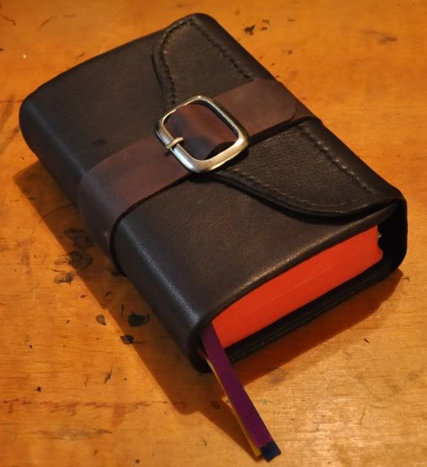 Now, on to the goods. It's a cover for my girlfriend's prayer book. I used deer hide, oil tanned leather, and the extra hip buckle from one of my old kilts... and it's hand stitched- didn't use one of those "sewing awl" things; used a plain awl and thread with a needle on each end.