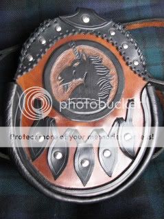 Thanks for the nudge Chuck. Here are a couple of pics of my latest creation, inspired by the ideas and craftsmanship I've seen on this forum. The unicorn in the middle is from Clan Cunningham's crest. I had a bit of a problem with the gusset gaping open on both sides, and ended up wetting it and clamping in the closed postion and that seemed to take care of it.