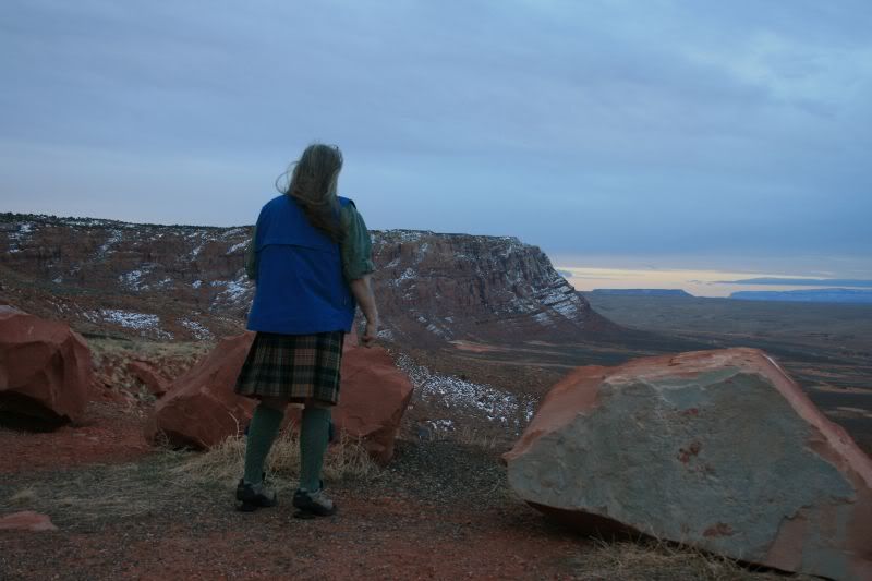 Went kilted for comfort for the long drive down and back and the long sit for the 8 hour conference. Took a couple pics at Antelope Pass on the way down. Cold and windy. That's the Echo Cliffs on the left with the snow and the Shinumo Alter on my right - that mesa looking thing. Its near Marble Canyon which you can't see that becomes the Grand Canyon downriver a few miles. Far right is the Kaibab Plateau (aka Buckskin Mountain). The road to the North Rim runs down the top of that forested oasis in the canyonlands.