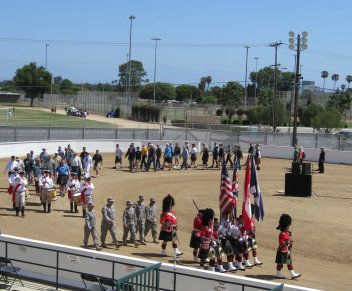 Both mornings there was a "Salute to Veterans" during the opening ceremonies. Here is the Sunday group -- all veterans in attendance were invited to join in walking a circuit around the dignitaries' stand, led by the color guard and a reenactment group.