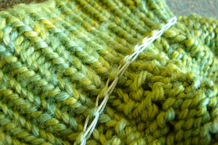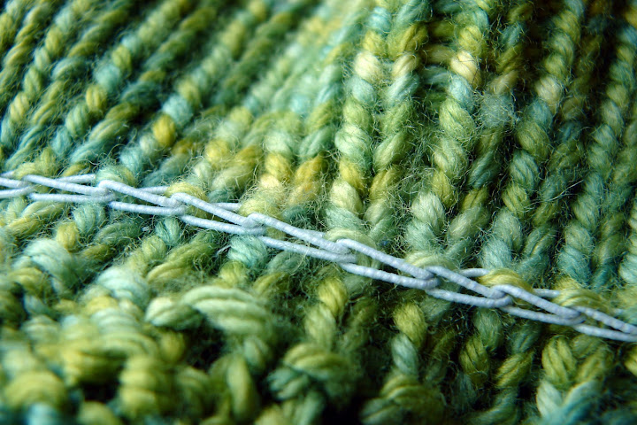 No doubt you recall the green knee high socks I recently made for my wife. They look great, but unfortunately don't stay up. Turns out my wife's legs are shaplier (is that a word?) than mine and she could have used a bit more of a decrease at the top of the leg than I did. Elastic to the rescue! Here's how I managed to add elastic to the inside of the k1 p1 ribbing: