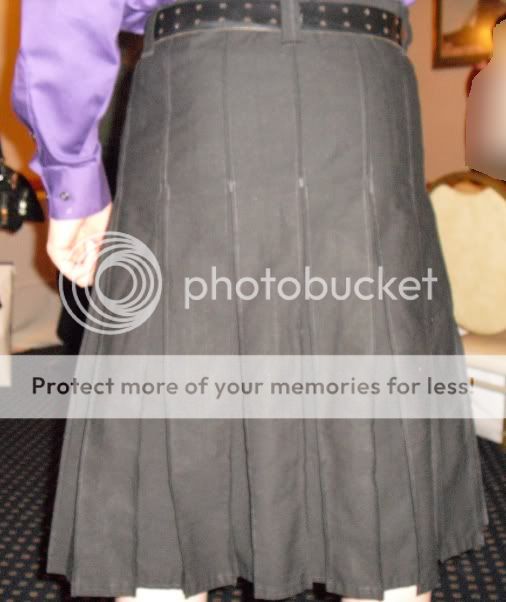 As requested, I was able get a pleat shot on Saturday, when I wore my kilt to the "groom's dinner" (aka rehearsal dinner, even though we didn't have a rehearsal). I received many compliments, and only one "Why are you wearing a dress?", but that was from a young boy with special needs, who didn't mean it in a bad way.. Obviously, they're a tad wrinkled and such, but this was after being worn for 7 hours straight, in cars, out of cars, through a long dinner, etc, and I didn't even have the time to iron it that day. =)