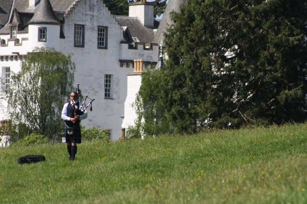 OK, I have a couple of photos. My youngest daughter was there with me, clutching the family camera, and inexpilcably we have ended up with dozens and dozens of shots of guys tossing the sheaf (I didn't even compete in sheaf!), a billion shots of the Atholl Highlanders (well, they were spectacular), pics of a cute dog that caught her eye, and about a thousand of the surrounding extremely scenic scenery. Pics of me? So far, just a handful unless you count sneak shots of my armpit taken from the next chair. *Sigh.*