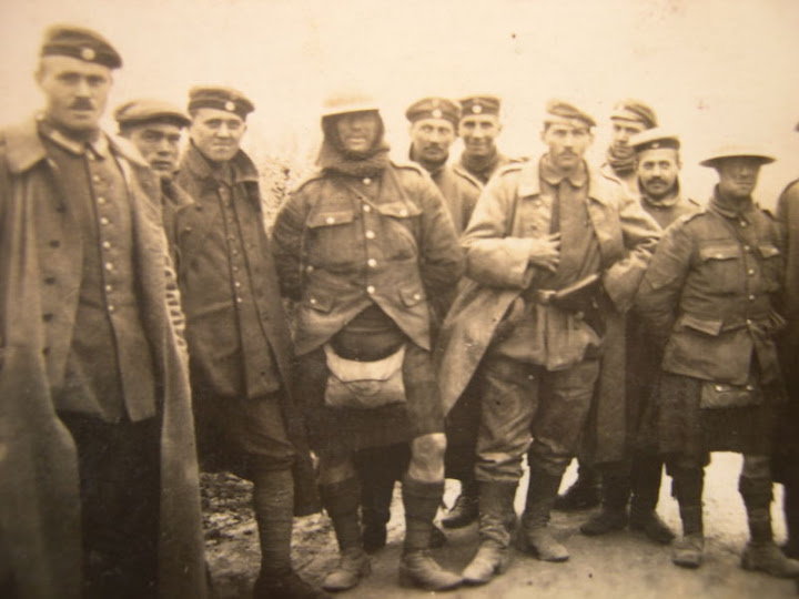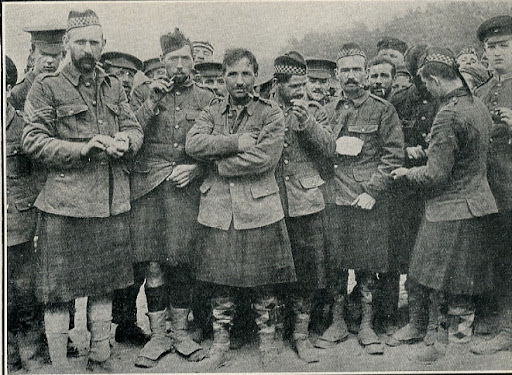 Here's some pics of POWs from WW1. Note that the Kilties are the prisoners. Note how far back the Germans are standing.
