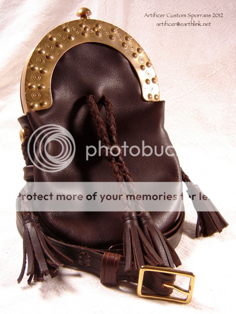I'd asked for a simple dark chocolate brown sporran, (similar in appearance to the one Artificer recently re-bagged for Jack Daw) along with a matching strap. Jack Daw's is a pigskin beauty, and I was taken with the design, but wanted something that would match my brown leathers for daywear. If you've ever dealt with him, you'll know how easy Artificer is to work with. He verified my requests, and when the materials I'd chosen required a slight re-design of the side tassels, he contacted me to make sure the workaround was acceptable. As you can see from the photos below, it's considerably more than acceptable... It's a beauty that I find elegant in its simplicity. Thanks again, Scott, for another heirloom sporran. You're always a pleasure to deal with and your work is absolutely top notch!