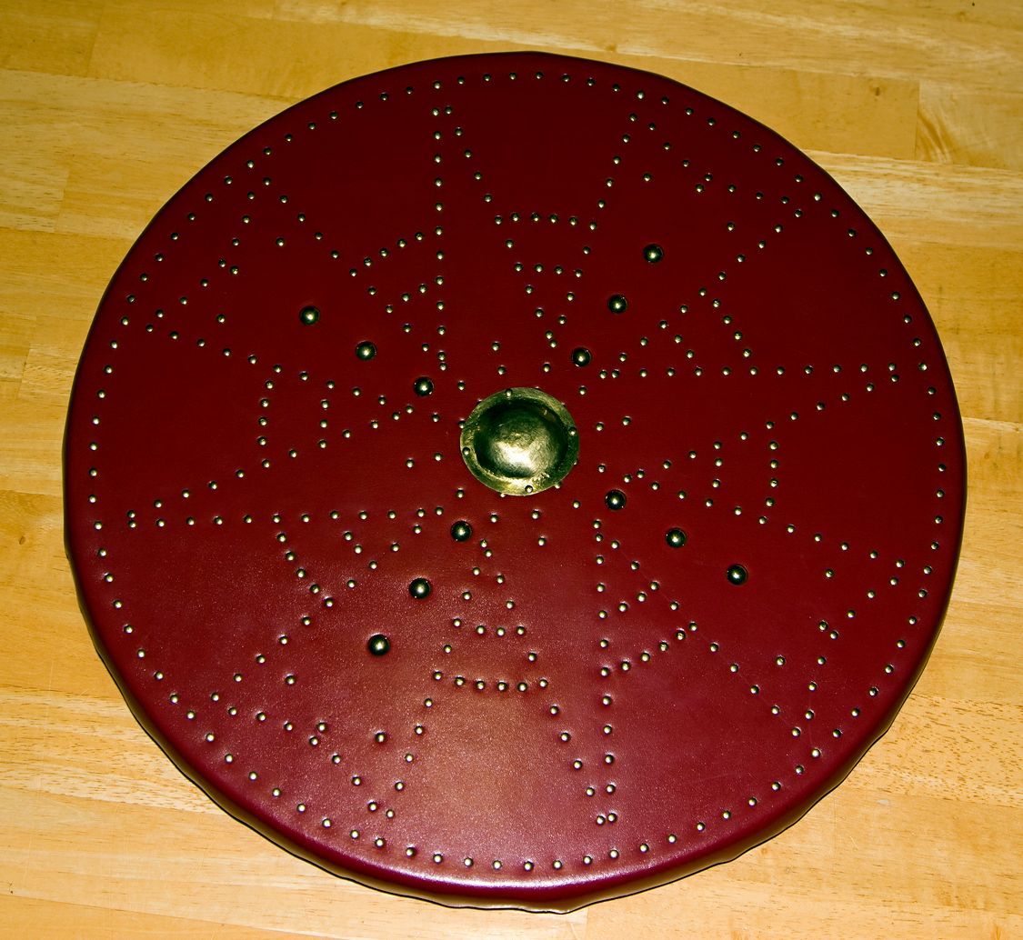 He decided to make a Targe for me. This this is a very large item and it fits my mammoth forearms quite well. He covered it in a deep red leather and the brad pattern is from a targe found at the battle of Glenlivet See Here The backing is calf-skin and the seam is covered in a strip of the MacKinnon modern tartan. Talk about a gift for a king!